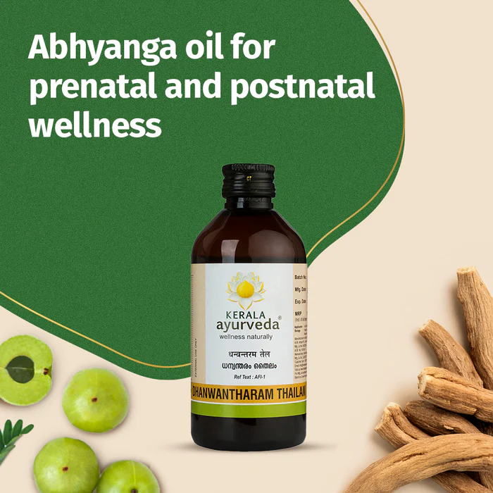 • Massage Oil for New Mothers: Dhanwantharam Thailam is a nourishing and relaxing Abhyanga or massage oil that helps ease stress during women’s prenatal and postnatal periods.