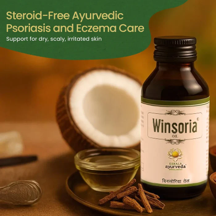 Kerala Ayurveda Winsoria Oil is an Ayurvedic proprietary formulation that helps alleviate psoriasis and eczema. It minimizes itching, skin discoloration, redness, scales, and sores. Winsoria oil also aids in reducing inflammation and skin exfoliation associated with skin conditions.